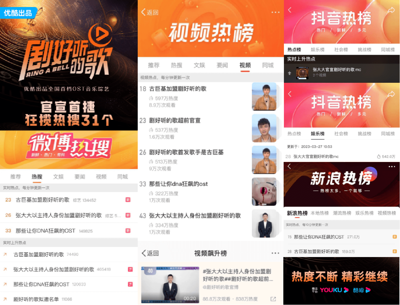 《剧好听的歌》不仅要唱共鸣还要“剧”共情,节目模式的创新将为综艺业态和娱乐营销带来最强驱动,嘉宾的真实表达和对音乐的坚持与热爱会给予用户更多生活信心优酷手机客户端。该综艺官宣后持续引发热议,截至发稿累计全网热搜31个,相关话题累计阅读近2亿。