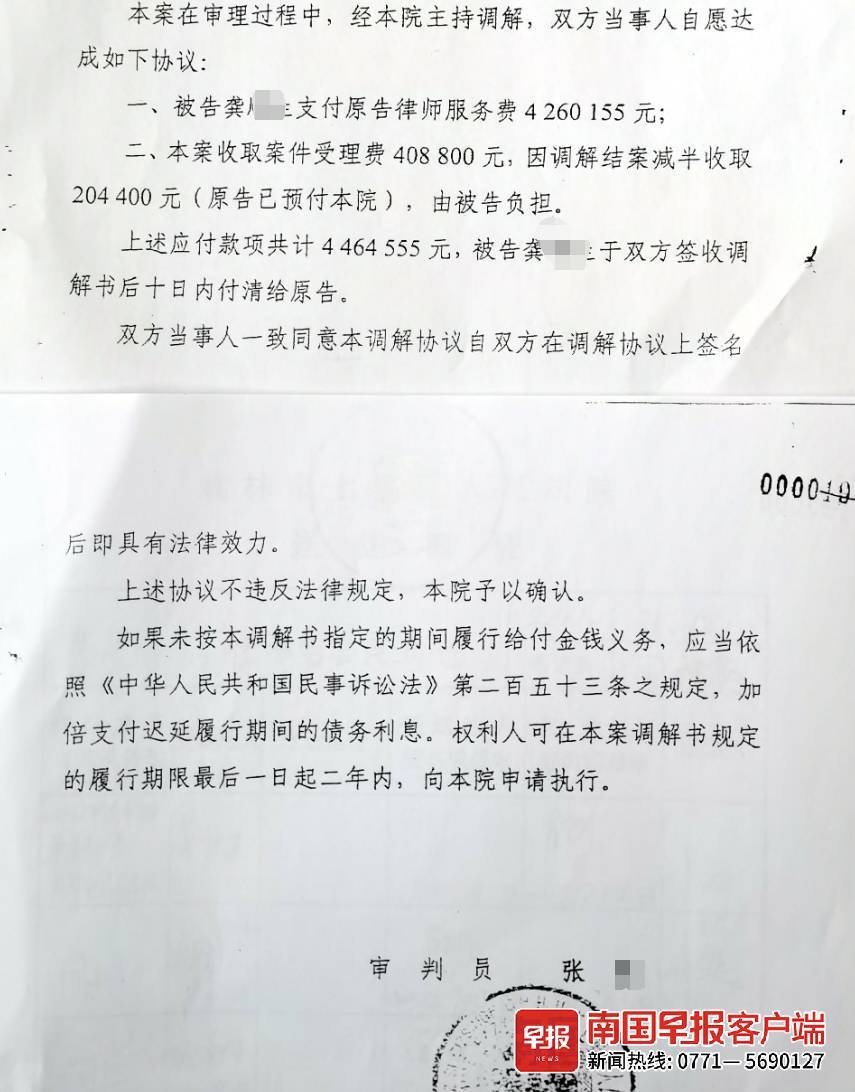 2013年7月5日,龙某领取了调解书,一直没有交给龚某苹果版纯净版影视大全。直到2015年7月,龚某获知有《(2013)星民初字第724号调解书》,他大吃一惊,原合同约定60万元的律师费,这样一调解就变成了426万余元的巨额律师费。