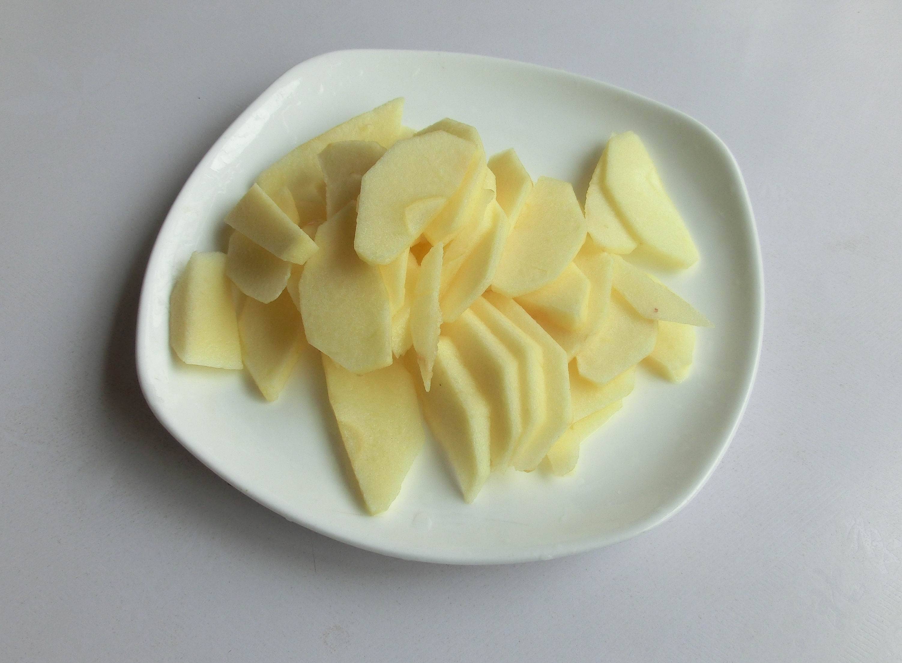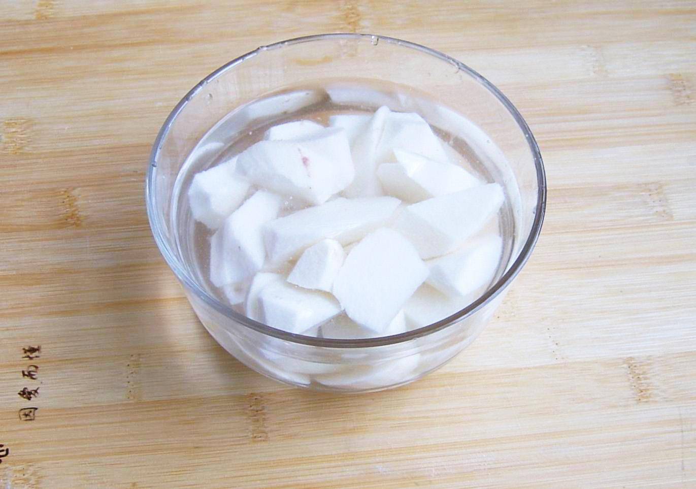 3、怀山药洗净苹果7公开版和,去皮,山药皮的黏液容易使皮肤过敏,去皮时可带上手套,切成滚刀块,放入淡盐水中,防止氧化变黑;