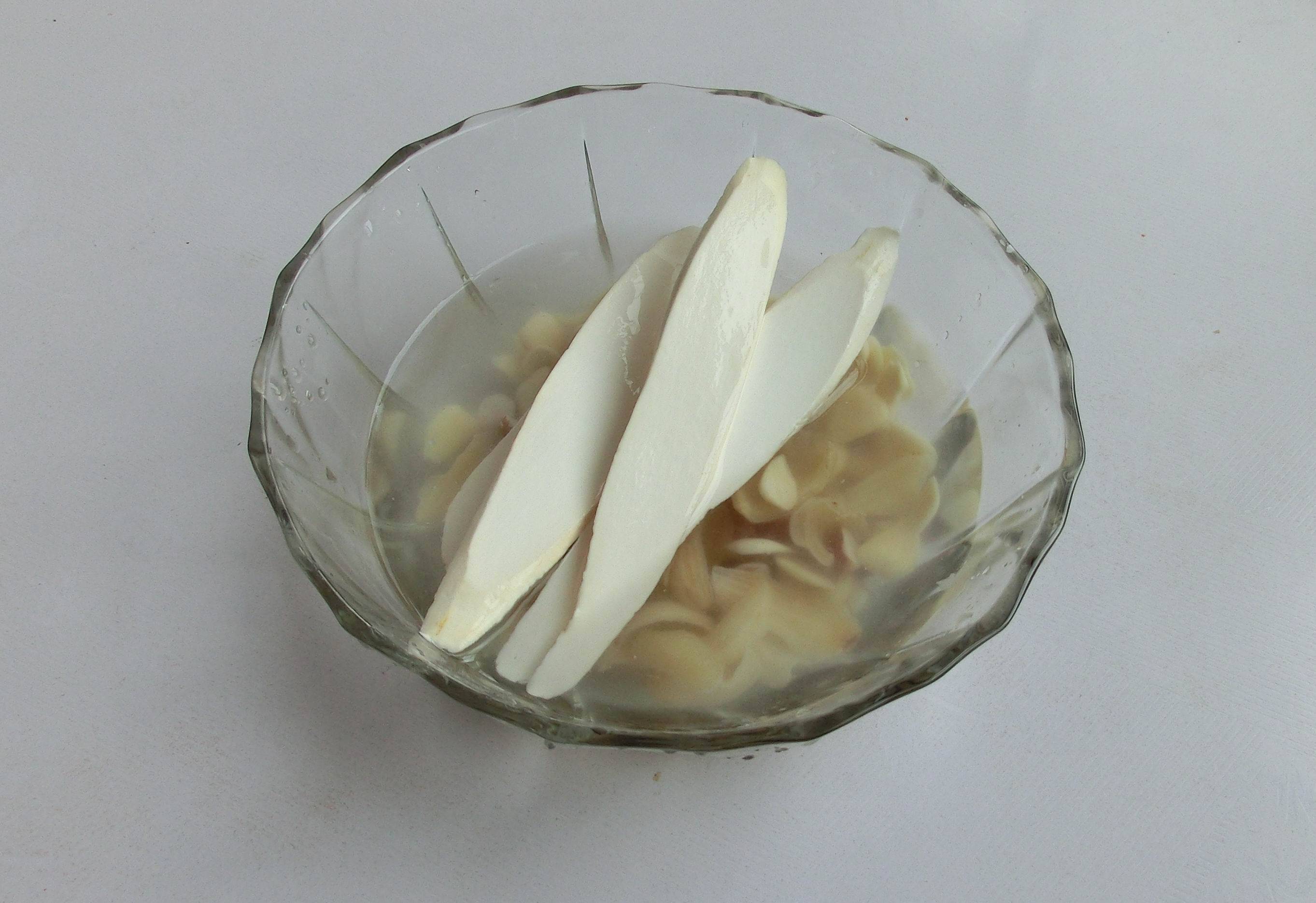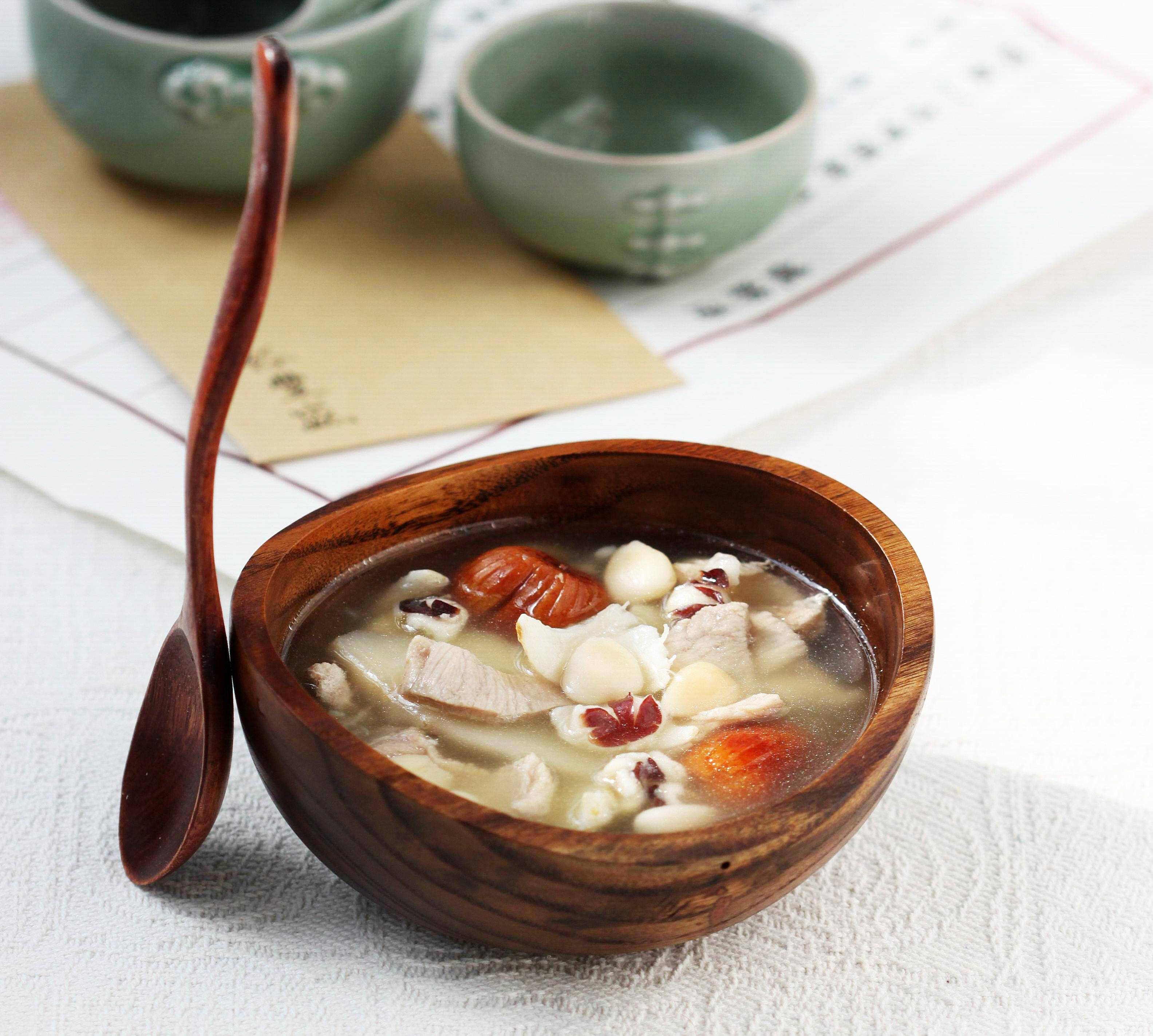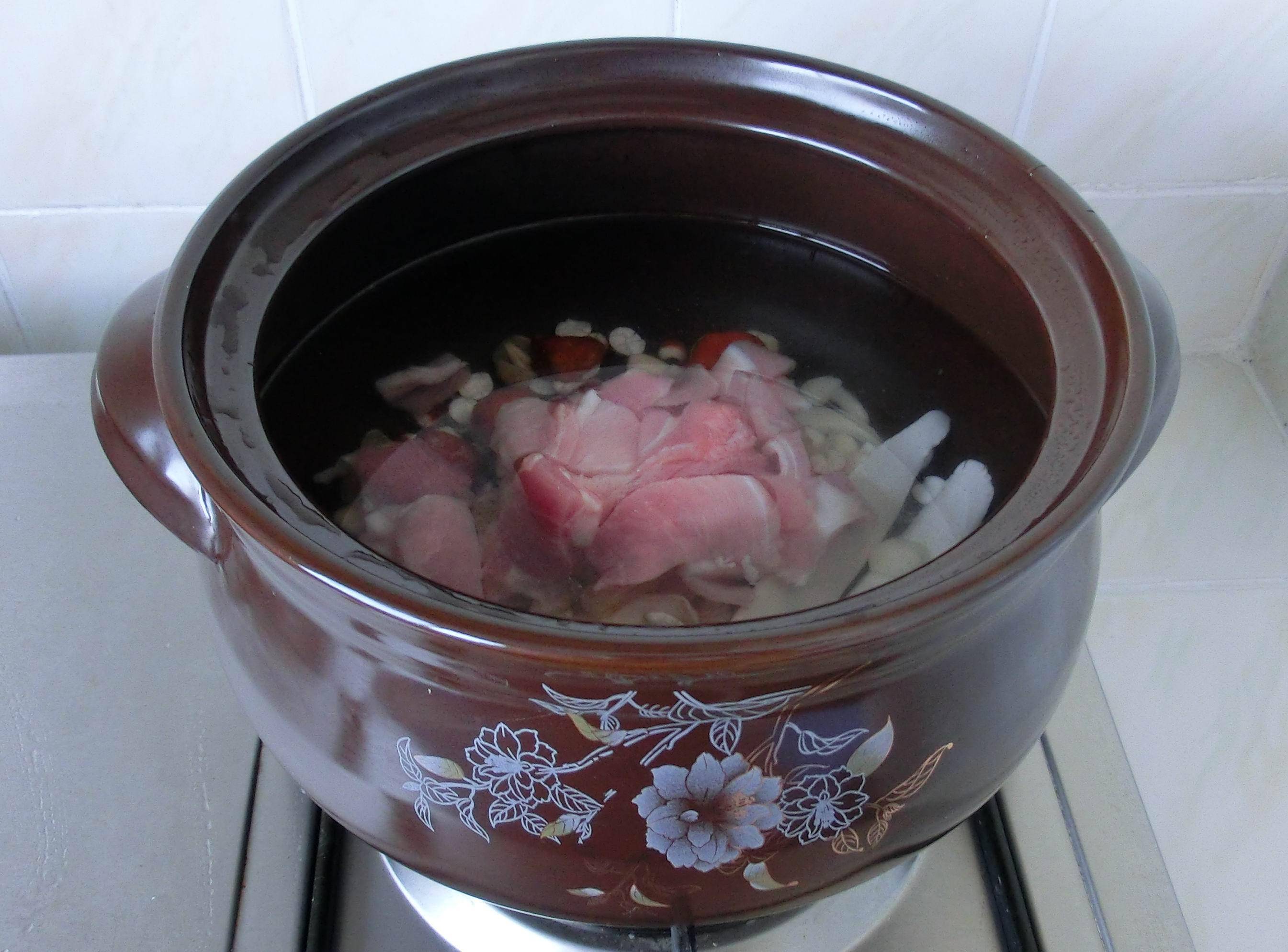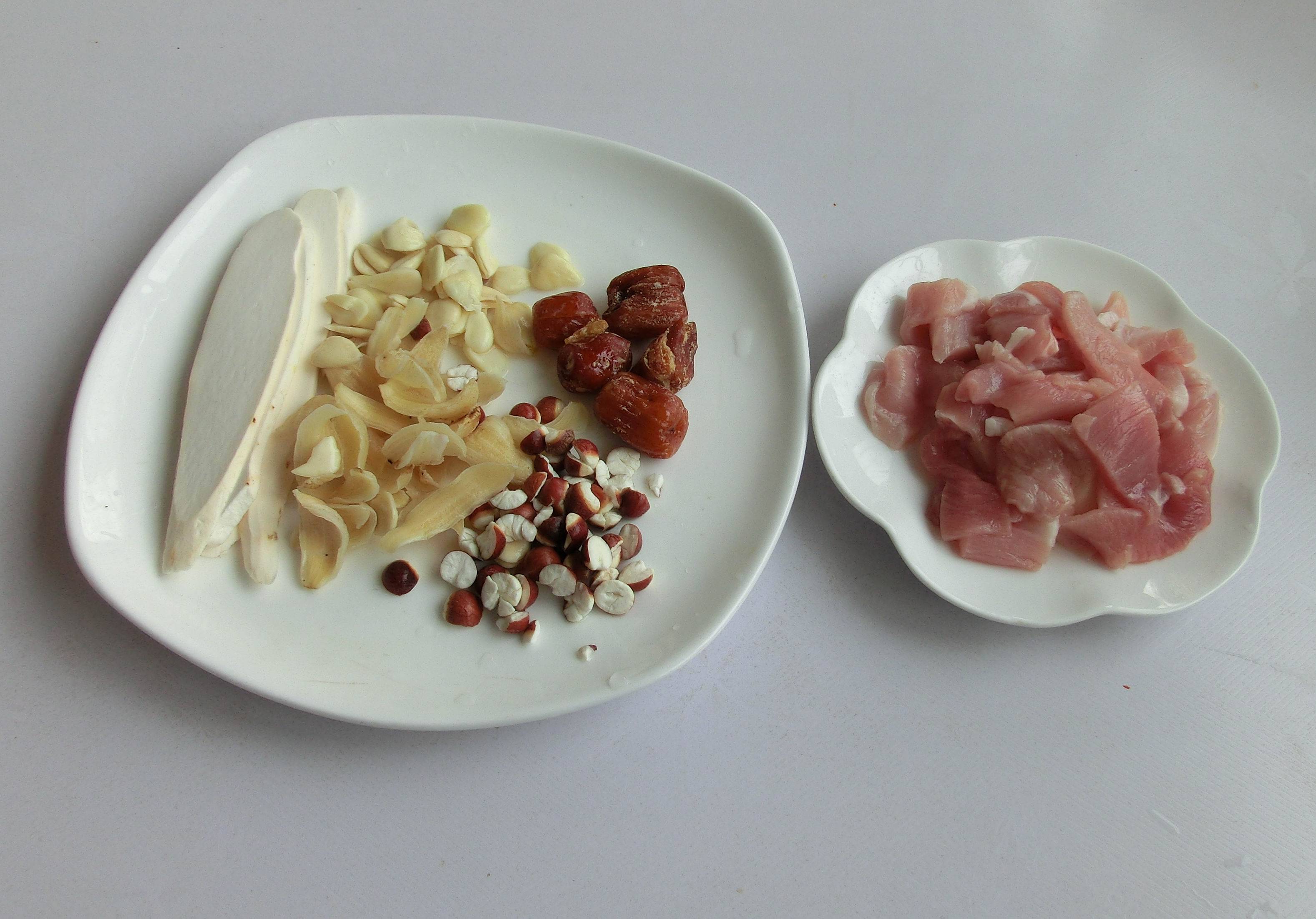 材料:淮山25克、芡实20克、百合30克、南杏15克、蜜枣5枚、瘦肉100克、盐适量
