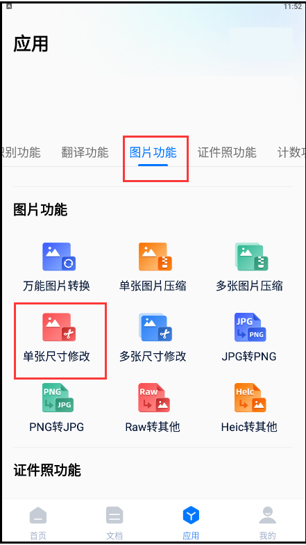 步骤二 进入 【应用】功能后选择【图片功能】——【单张尺寸修改】,对于图片数量多的人来说,我们可以选择【多张尺寸修改】,既然能批量处理的话那不是更加方便省时间吗?这里关于图片处理的功能还是比较详细的,除了图片格式转换之外还有压缩功能,不错不错,感觉赚到了华为手机怎么修改照片大小 。