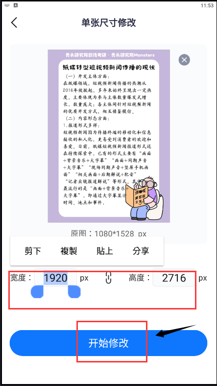 步骤四 到这一步我们直接就可以设置想要的照片尺寸了,把宽度和高度设置成自己想要的数值,设置好了直接点击【开始修改】,几秒后图片就能修改完成啦华为手机怎么修改照片大小 。
