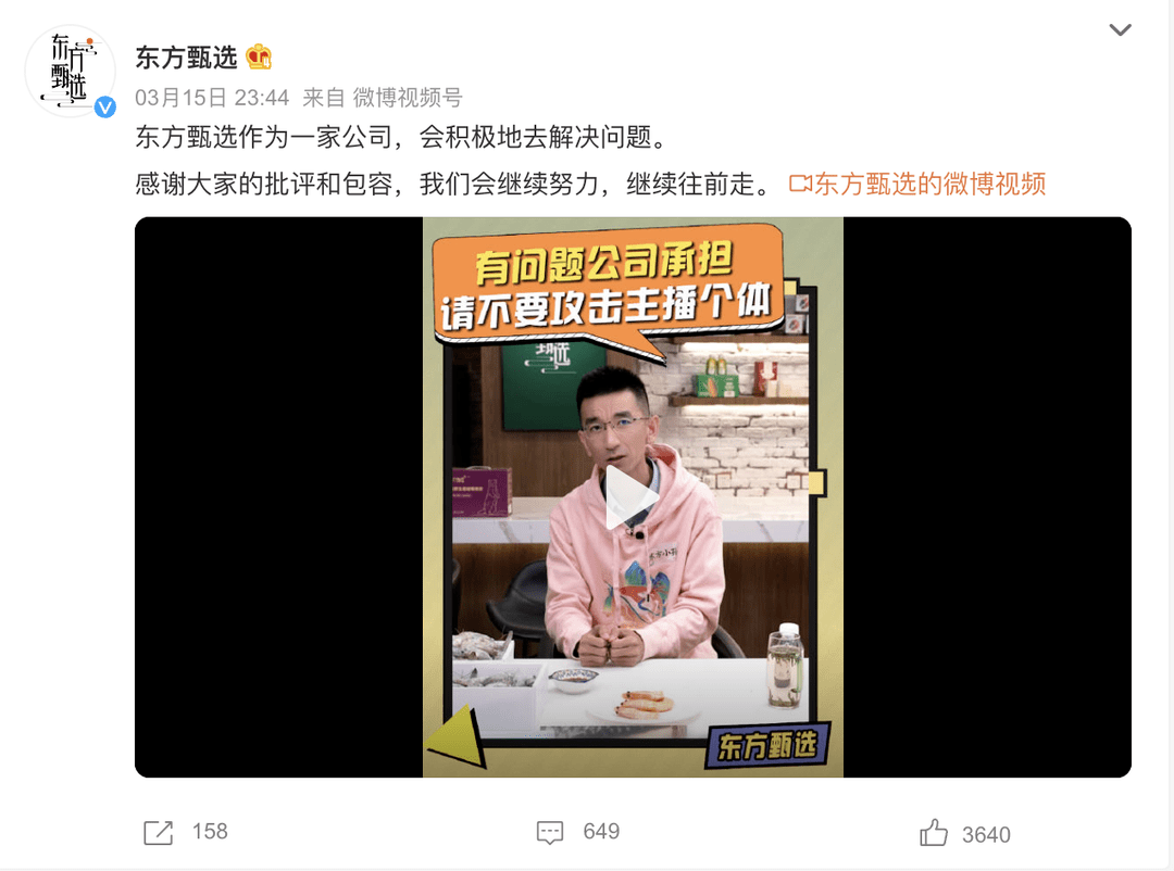 3月15日晚,东方甄选CEO孙东旭回应称,该起事件发生在去年6月,并非东方甄选自营的大虾易次元官网下载苹果手机版。公司感谢各种批评和监督,出现问题一定会积极面对和改正,但希望大家不要将矛头指向主播,“产品的选择以及各个环节的把关,并不是由主播完成的。如果大家实在想出气,可以针对我,毕竟我是公司法人代表”。他表示,有问题东方甄选会发动客服力量、沟通资源去解决,大家不用恐慌,有问题公司承担,该赔付会赔付。