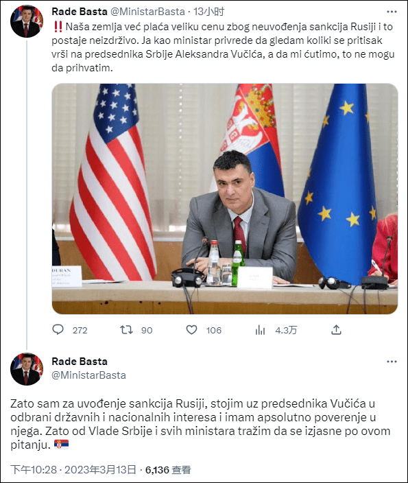 3月14日,塞尔维亚经济部长巴斯塔在社交媒体上表示,因为面临着来自美西方施加的难以承受之压力,他认为塞尔维亚应该加入对俄罗斯实施制裁的行列,并要求政府和其他部长就此问题统一立场,立即作出决定苹果12迷你版长啥样呀。此言一出,立即在塞国内引发轩然大波。