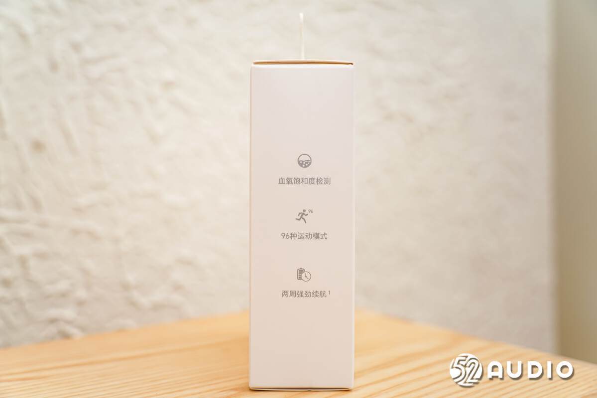 侧面标有产品三大主要亮点:血氧饱和度检测、96种运动模式和两周强劲续航睡眠监测手环推荐苹果版。