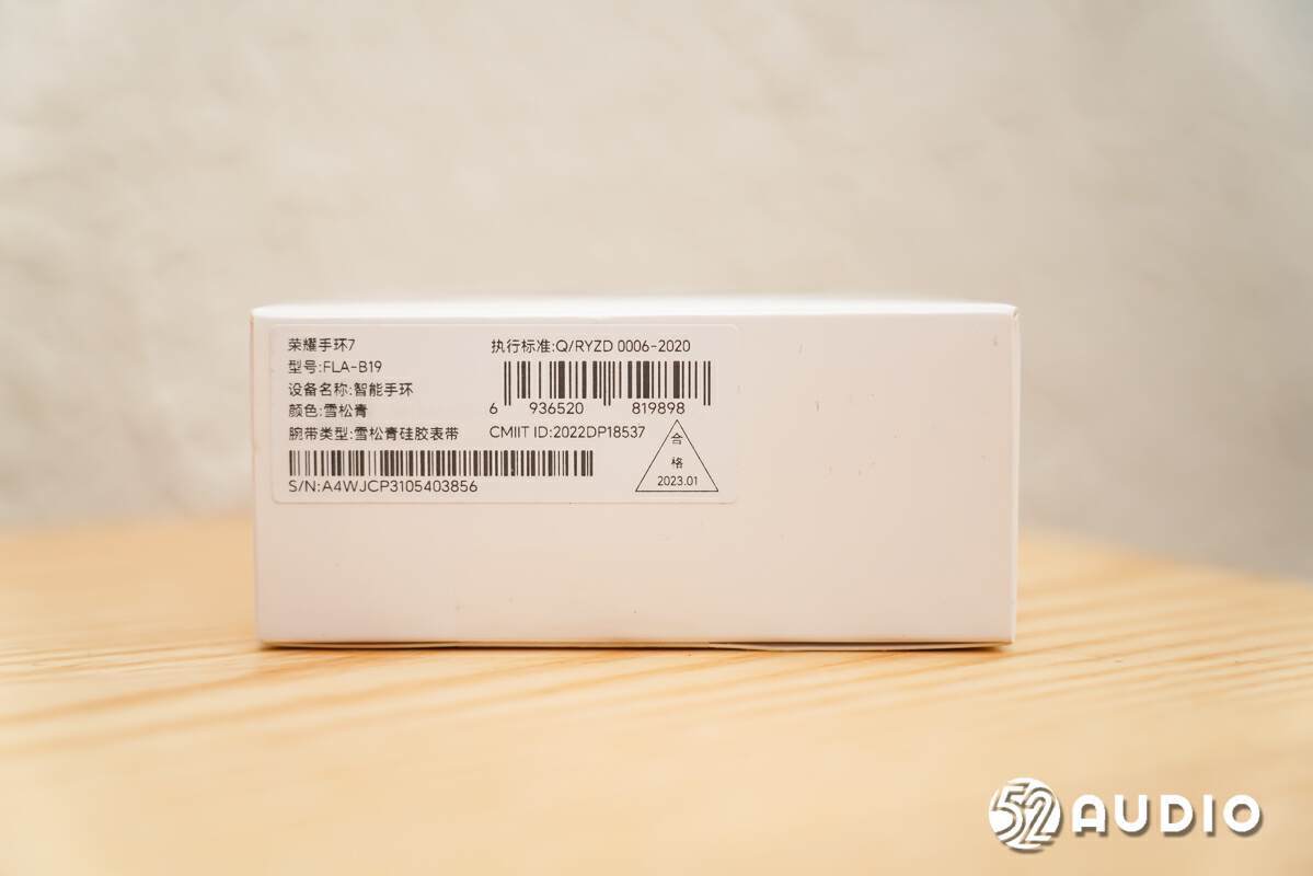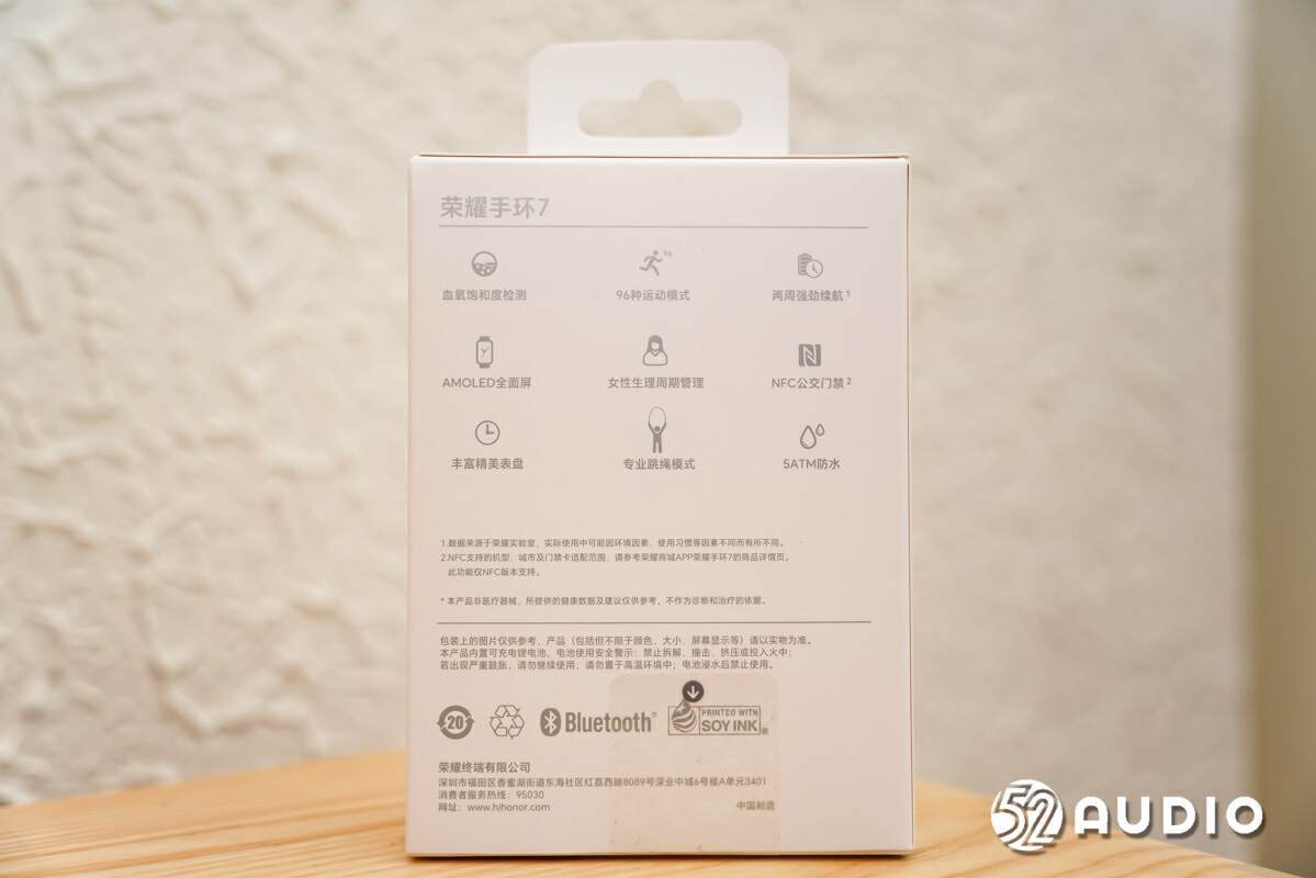 外包装是白色方形纸盒,正面左上角是荣耀HONOR品牌logo和产品名称荣耀手环7,中间是产品整体外观渲染图睡眠监测手环推荐苹果版。我爱音频网手上的是雪松青配色。