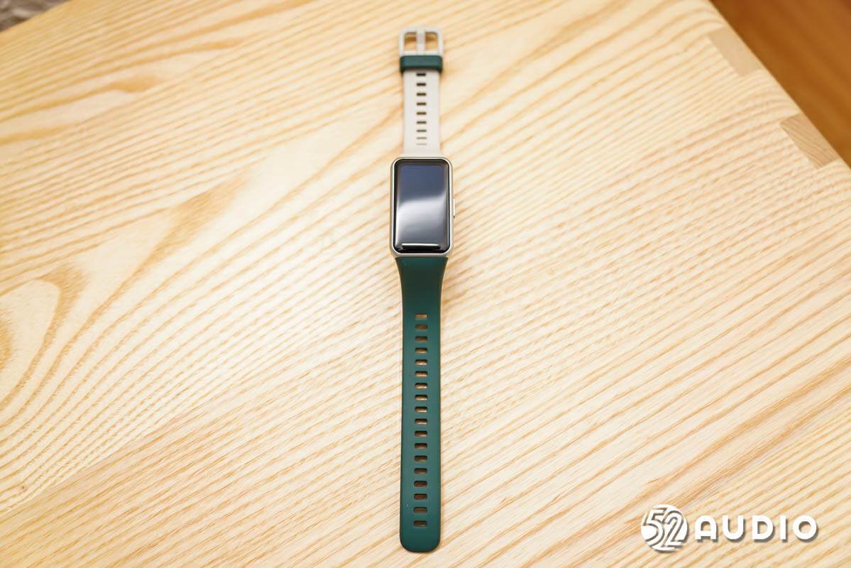 荣耀手环7整体外观一览,雪松青配色的表带为撞色设计,表带材质为硅胶,表带宽度16mm(渐变后宽度)睡眠监测手环推荐苹果版。两边表带中间都设有一排开孔,保证空气流通,利于通风散热、蒸发水分,夏天和运动时佩戴体感更清爽。