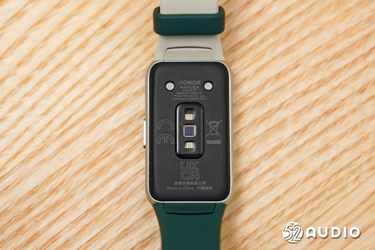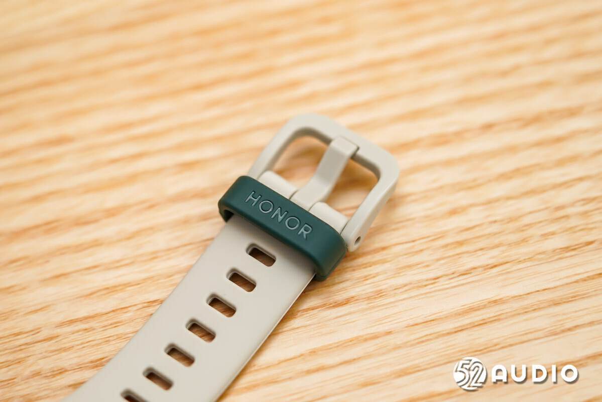 表带环扣为雪松青色,表面刻有荣耀HONOR品牌logo睡眠监测手环推荐苹果版。