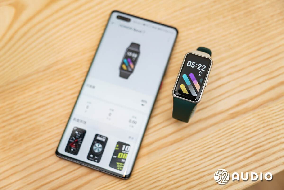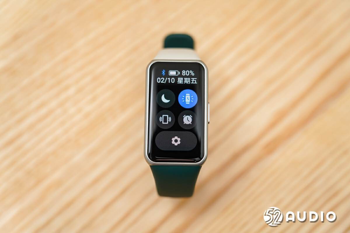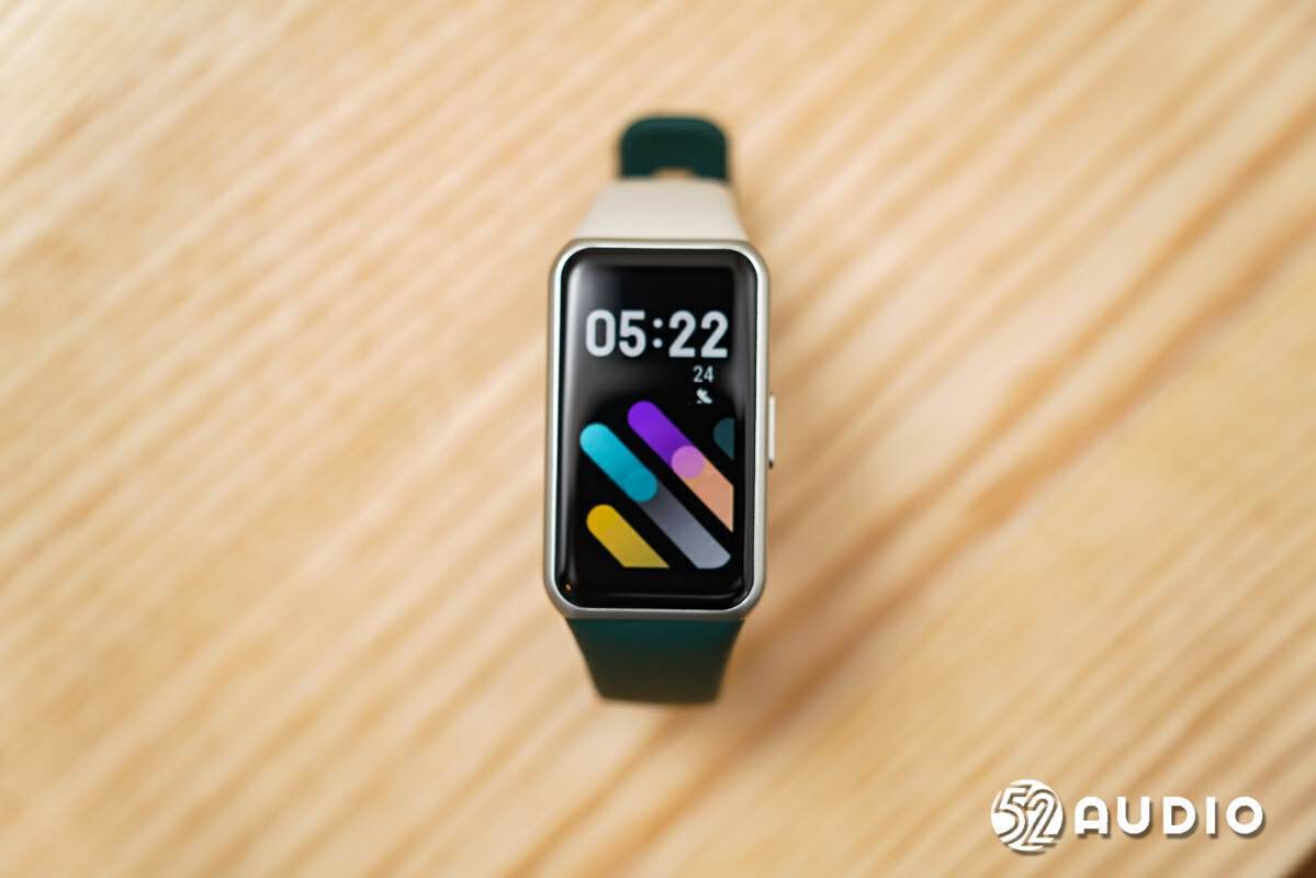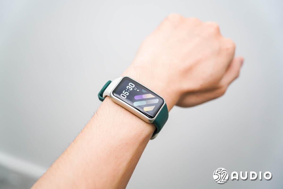 实际佩戴效果一览,设备体积大小适中,体感轻盈;正面屏占比高,观感舒适,亮屏模式支持抬腕亮屏、按键亮屏和触摸亮屏(默认关闭,可在设置中自行开启)睡眠监测手环推荐苹果版。