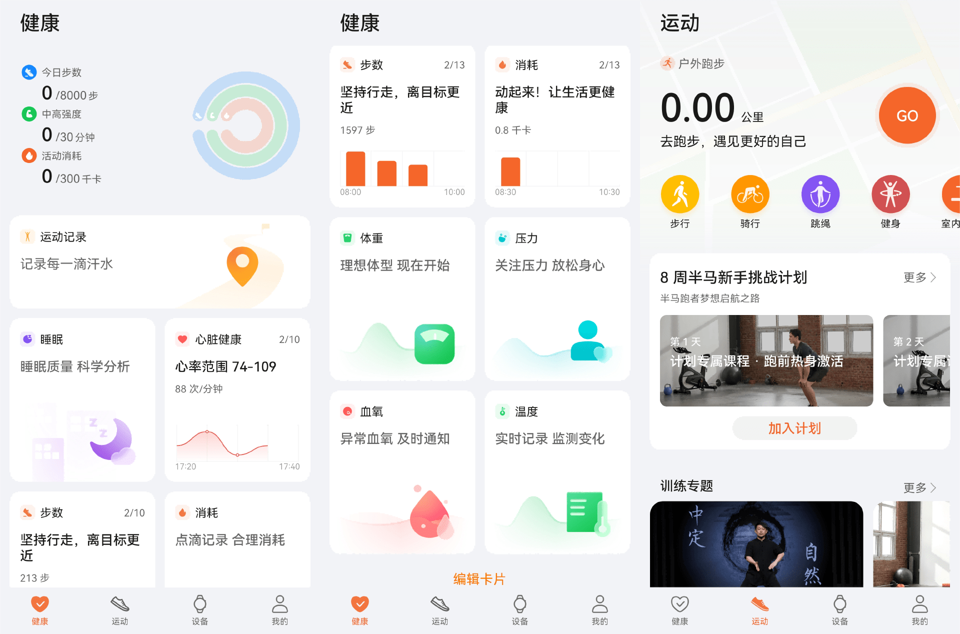 APP首页显示各项健康数据,包括睡眠、心率、步数、卡路里数等等;运动页设有各类运动记录功能的快速入口,下方展示运动计划、推荐训练课程等等睡眠监测手环推荐苹果版。