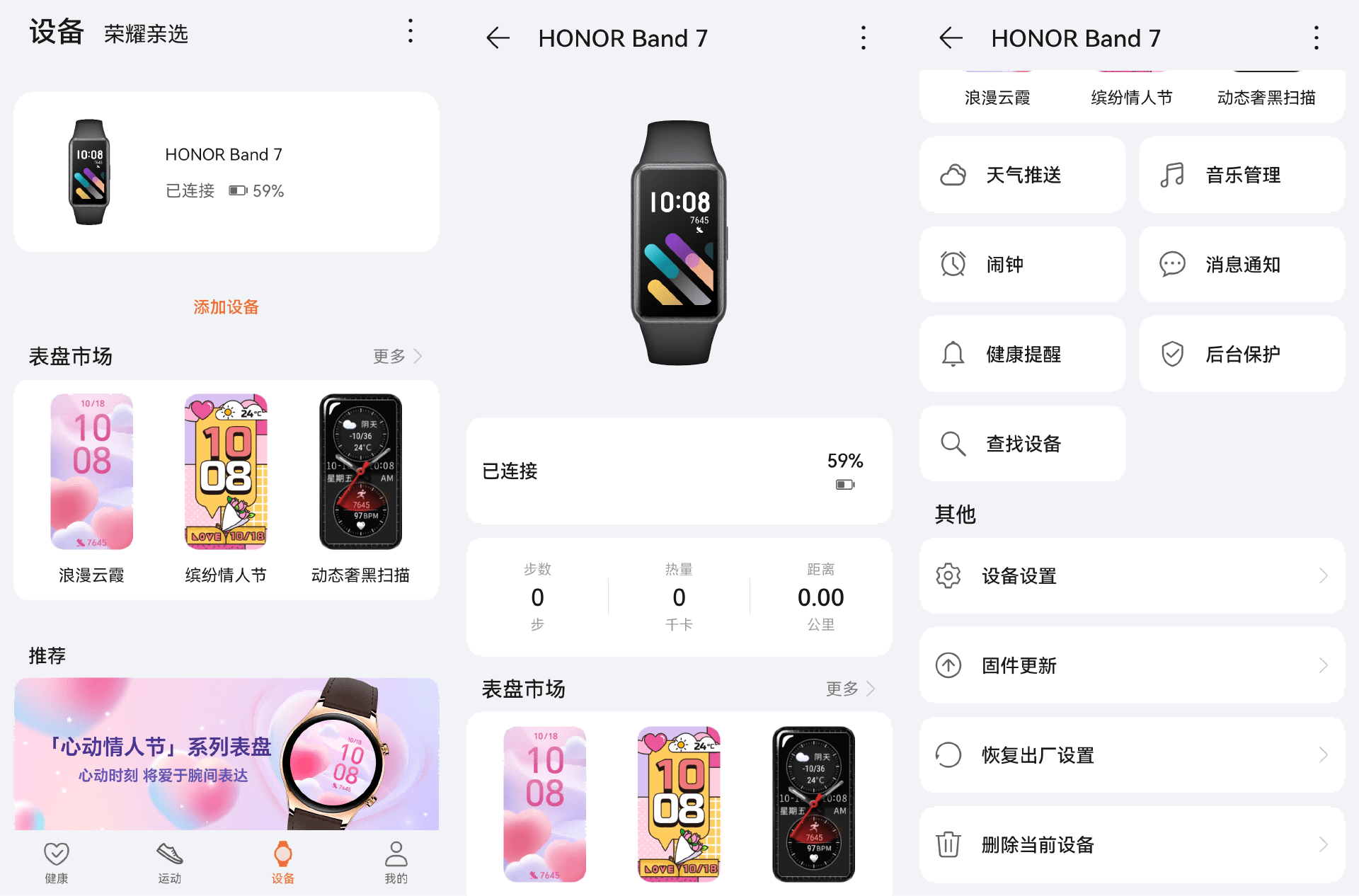 设备页会显示设备连接状态和剩余电量,中间则是表盘市场入口,下方展示推荐表盘睡眠监测手环推荐苹果版。