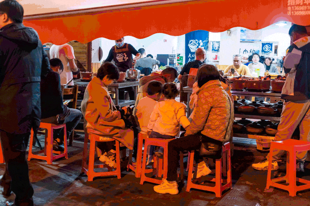 店门是敞开式的, 门口一整排的羊汤砂锅炭火,烟火气十足,是店家最好的招牌汤不火苹果版。