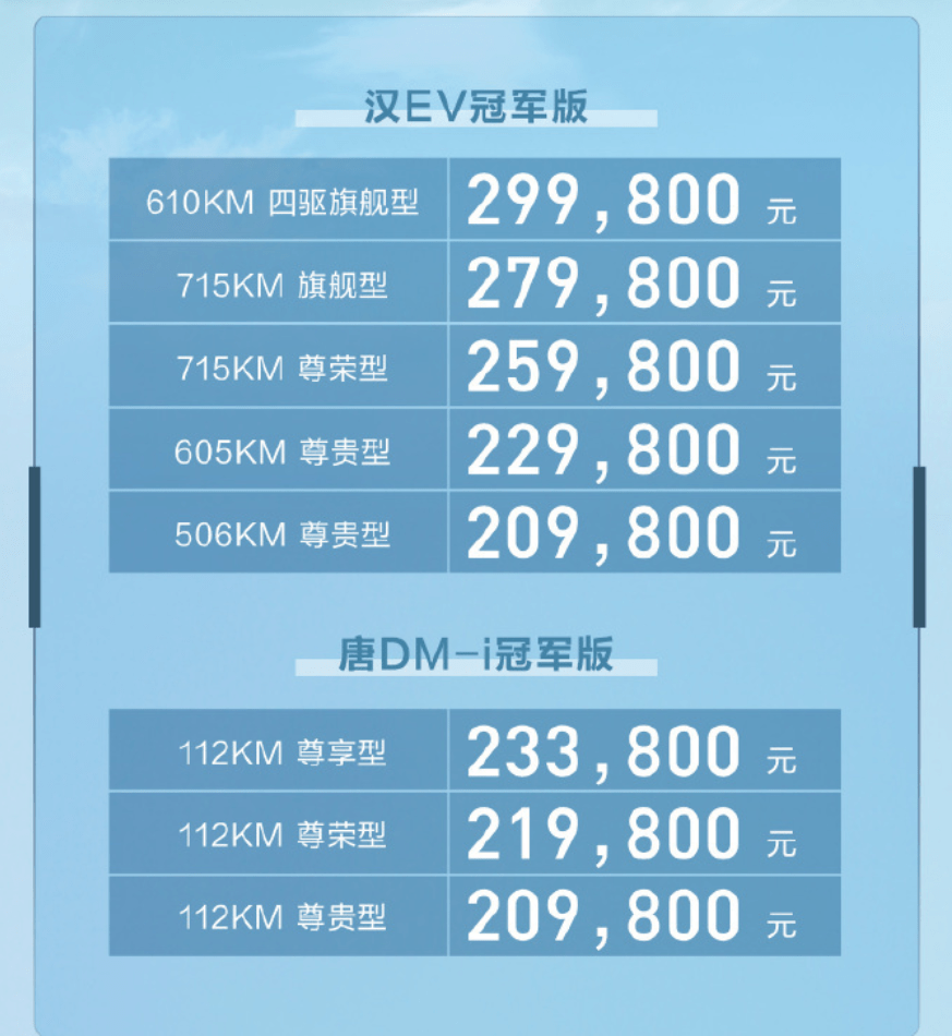 在此之前,2023款比亚迪秦PLUS DM-i冠军版车型凭借9.98万元的起售价格,成功搅动国内A级轿车市场格局来这分期苹果版。正因如此,汉EV冠军版和唐DM-i冠军版车型的售价也备受关注。此前有网传消息称,比亚迪汉EV冠军版和唐DM-i冠军版车型的售价分别为19.98万元和18.98万元。甚至还有传闻称,两款新车的起售价格将定为16.88万元。