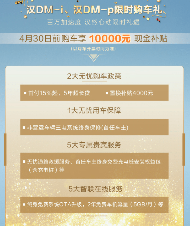 此外,比亚迪官方还宣布推出限时购车补贴,4月30日前购买汉DM-i、汉DM-p车型,可享10000元现金补贴来这分期苹果版。