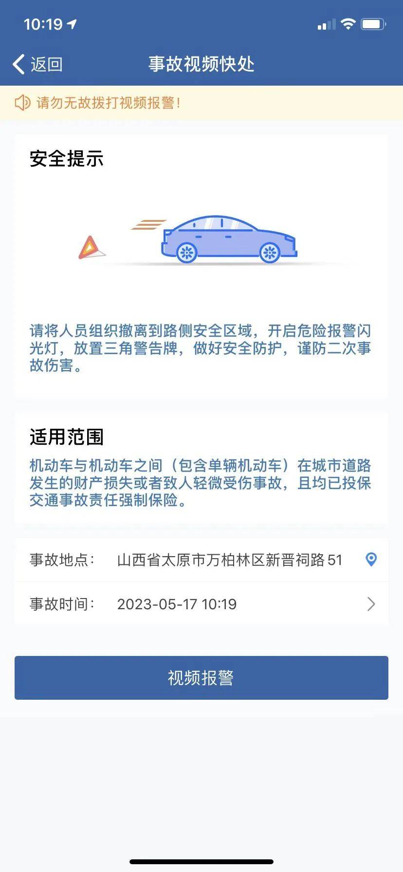 发生事故后,当事人在现场通过“交管12123”APP进行视频报警,系统自动定位事故地点信息(目前支持事故视频快处的范围为太原市六城区)交管12123手机版怎么查成绩。
