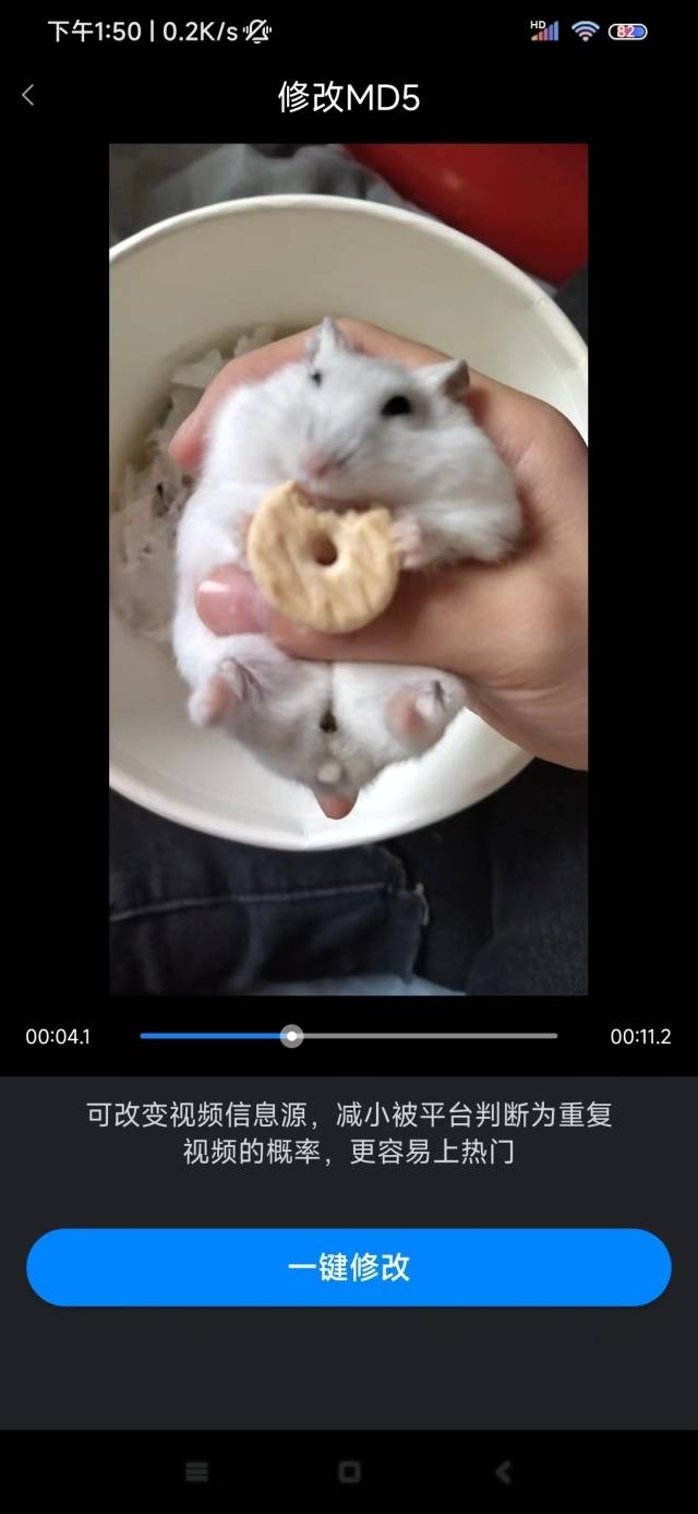 点击一键修改按钮,这样就得到了修改了信息源之后的视频文件了,再把这个视频保存下来上传,你就会发现热度确实比之前好了不少小米手机好用吗。