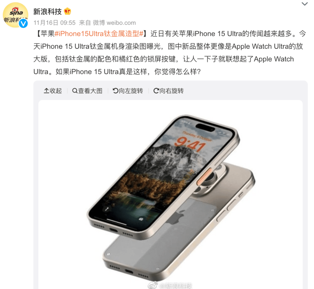 同时,新浪科技也展示了iPhone 15 Ultra钛金属机身渲染图华为荣耀金属材质手机壳 。其整体风格与最新发布的Apple Watch Ultra接近。
