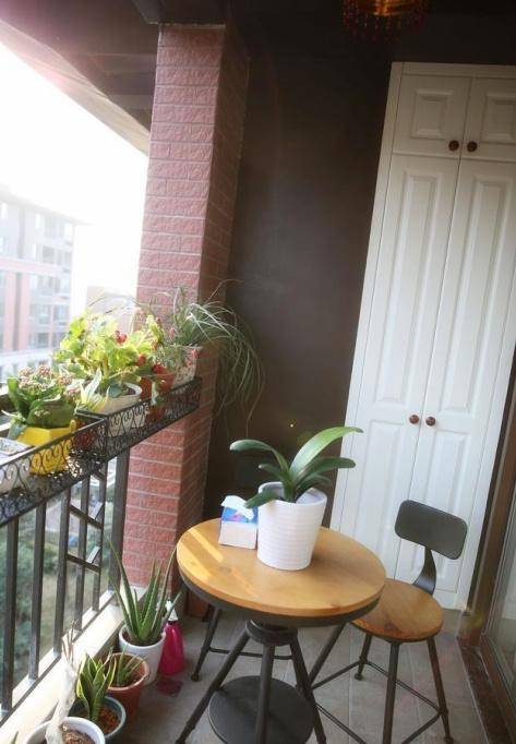 阳台苹果版累群挂 ,种了很多花花草草,还放了桌椅,没事的时候坐在这里喝喝茶