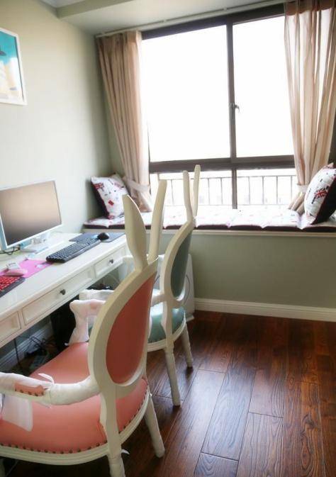 书房苹果版累群挂 ,有个大飘窗,上面铺了垫子、放了枕头,工作累了就躺在上面歇一会,还能看看外面的风景,很惬意