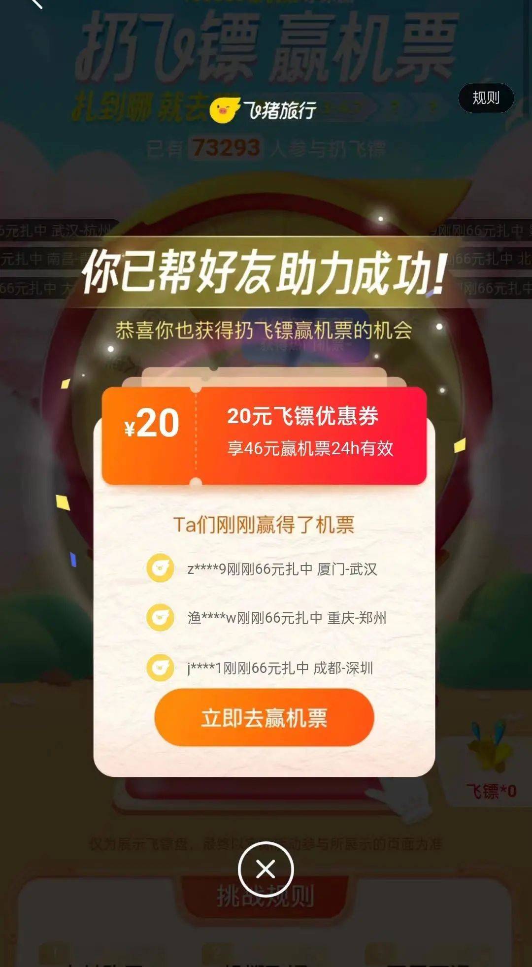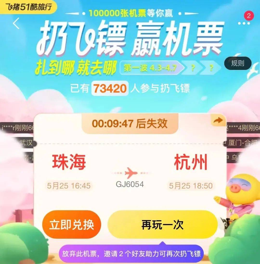 记者支付了66元体验,第一支飞镖首先扎中了目的地郑州,第二支飞镖则没有扎中任何出发地城市飞猪花苹果版。按照规则,只能微信再邀请2名好友助力。第二次,记者的目的地扎到了武汉,出发地依然没有扎中。记者再次邀请好友助力,终于成功扎中了一张5月25日下午从珠海飞往杭州的机票。