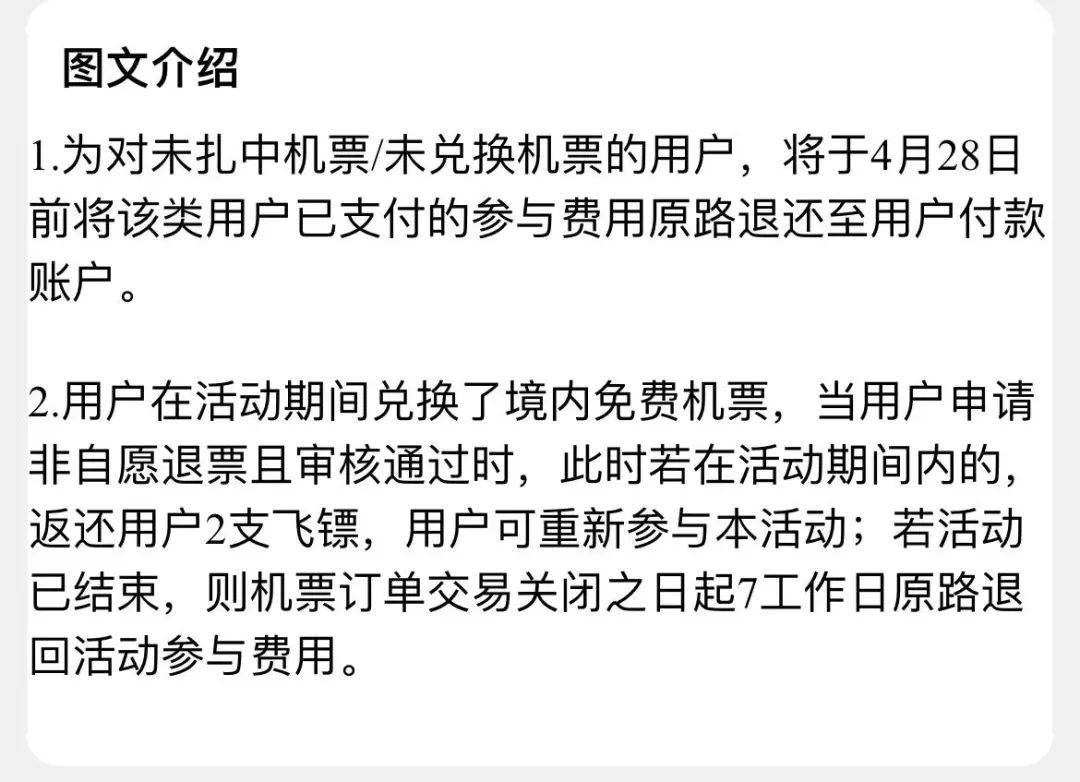 飞猪客服: 活动规则就是一个随机的,假如出发地离您比较远,您可能要自行购买机票或者用其他方式去到那个地方飞猪花苹果版。您觉得不合适您也可以不要,是可以退款的。4月21日活动结束之后,4月28日之前它会自动给您退款。如果你不参与的话,我现在可以帮您登记,72小时内退款。
