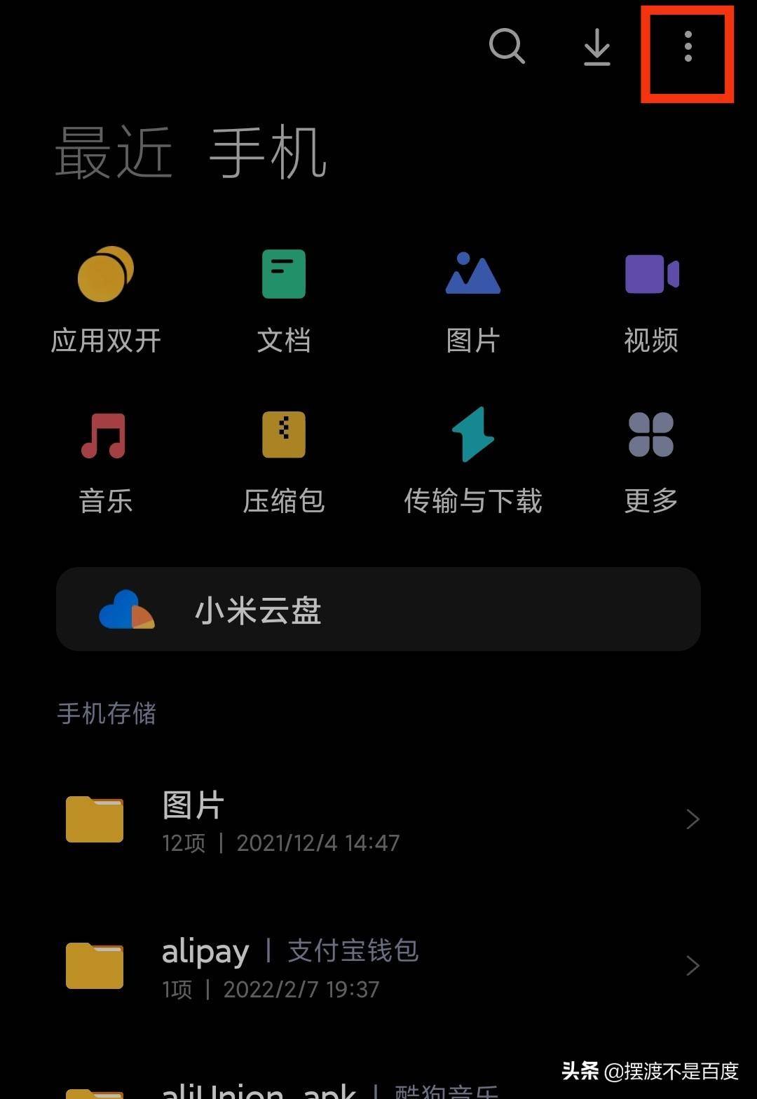 只有从文件管理里面去删除手机产生的缓存垃圾才能彻底清理干净;然后找到右上角的三个点;