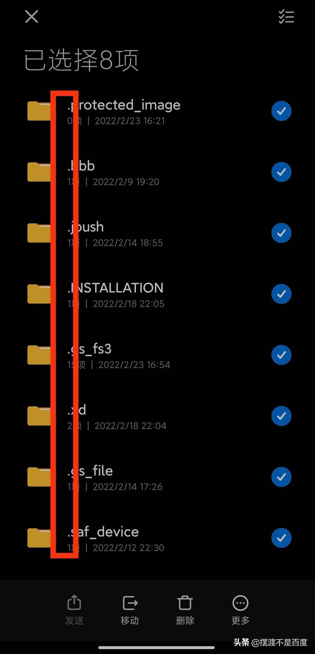打开之后手机内存不足怎样清理最彻底,所有的隐藏文件就都显示出来了,接着长按两秒,就能够选择文件,文件名前面有一个点的这些都是我们打开的隐藏文件,这些没用都可以选中删除;