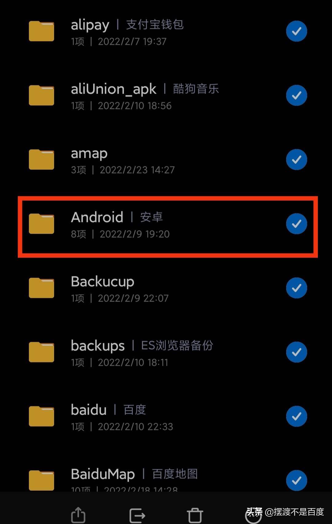 alipay、amap、aliunion_apk、backucup、backups、baidu、baidumap这些也可以选中删除,重点说一下“Android”,“Android”文件夹里面储存着所有应用的缓存文件,其中就包括微信下载保存的文档文件,路径在“Android-data-com.tencent.mm-MicroMsg-Download”,这里面如果有重要的文件就不要删除,其它基本都可以删除,如果没有重要文件,我们就直接“Android”这个文件夹删除掉就可以手机内存不足怎样清理最彻底。还不清楚微信文件保存路径的可以去看我前面的文章或者视频。