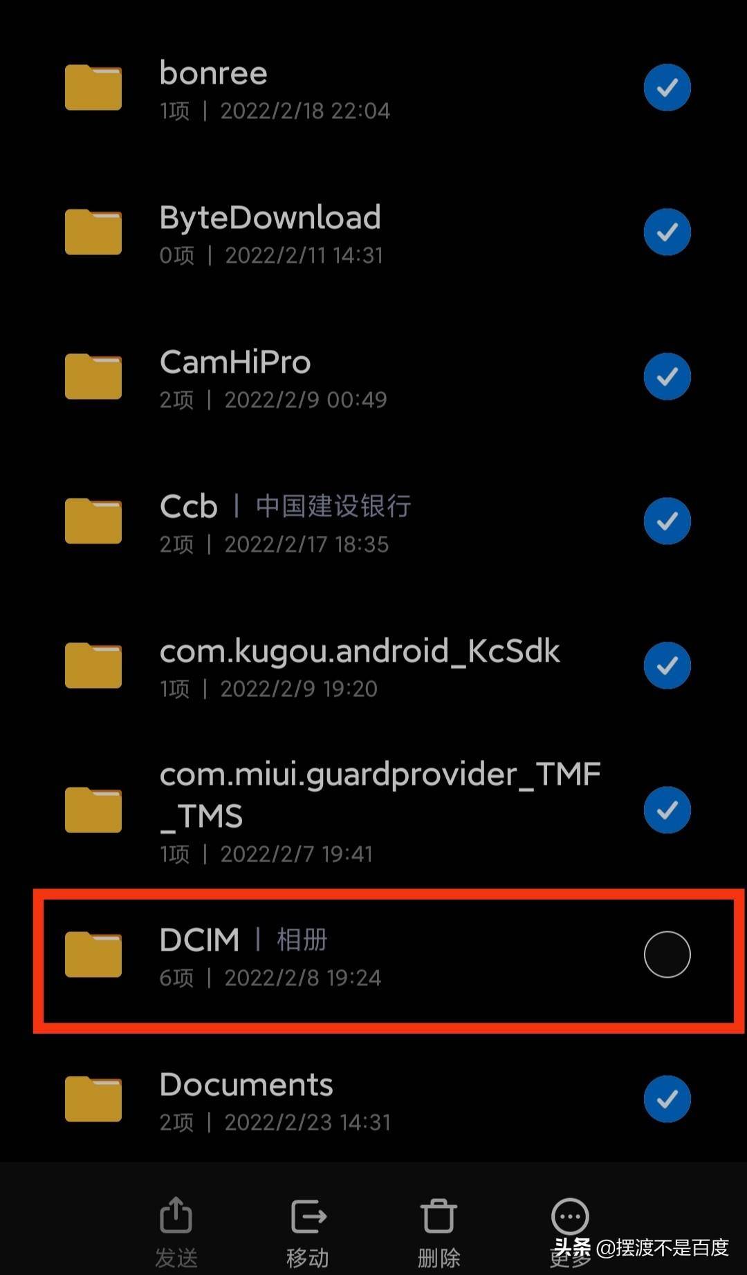 再往下手机内存不足怎样清理最彻底,下图所示勾选的文件夹都可删,“DCIM”是相册,就是手机相机拍照储存的文件夹,这个文件夹不可删,删了之后拍的照片就都没了,我们可以点进去选择性删除没用的照片;