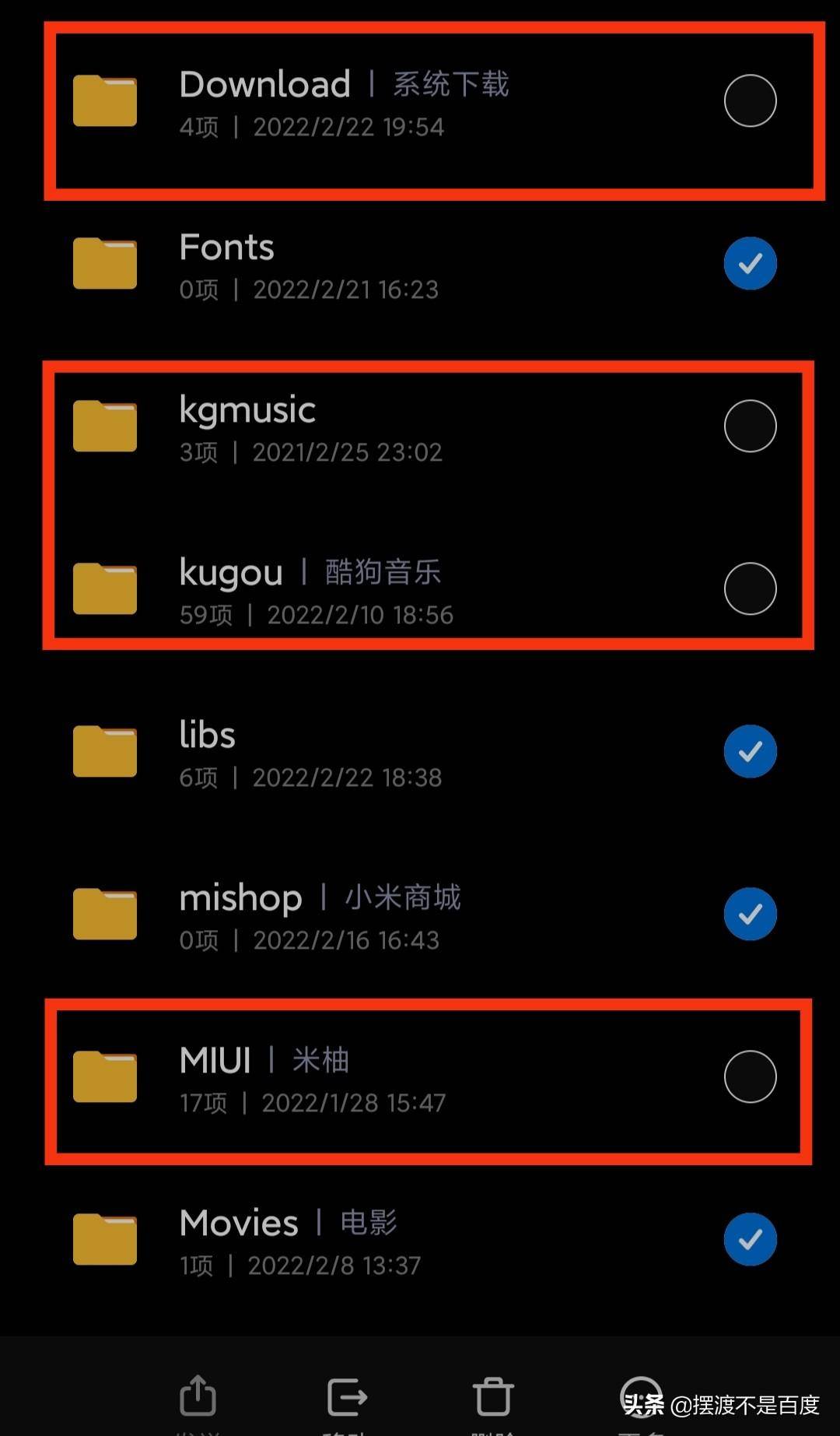 “Download”文件夹是我们手机自带浏览器或者手机系统更新版本下载储存的文件夹,一般没有什么太大用处,可以点击进去看看,自行选择删除;“kgmusic、kugou”这两个文件夹存储着使用酷狗音乐播放器下载的音乐和歌词等,不要删除,如果没有使用酷狗音乐播放器的可以删除;使用其它音乐播放器的,对应文件夹不要删除就好了;“MIUI”是操作系统产生的文件夹,不能删除(因为我拿的是小米手机示例,所以系统文件夹为MIUI,华为的系统文件夹是Huawei或者HarmonyOS),大家根据自己手机系统对应的文件夹不删就好手机内存不足怎样清理最彻底。
