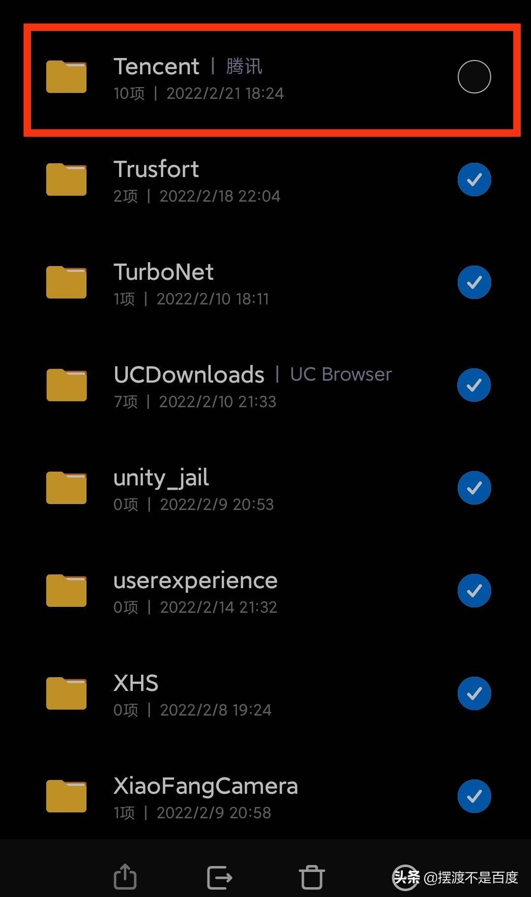 继续,“Tencent”这个是腾讯文件,也就是我们使用QQ保存的文件、缓存,有使用QQ的就不要删,没有就删掉;剩下的全部可以选中删除手机内存不足怎样清理最彻底。