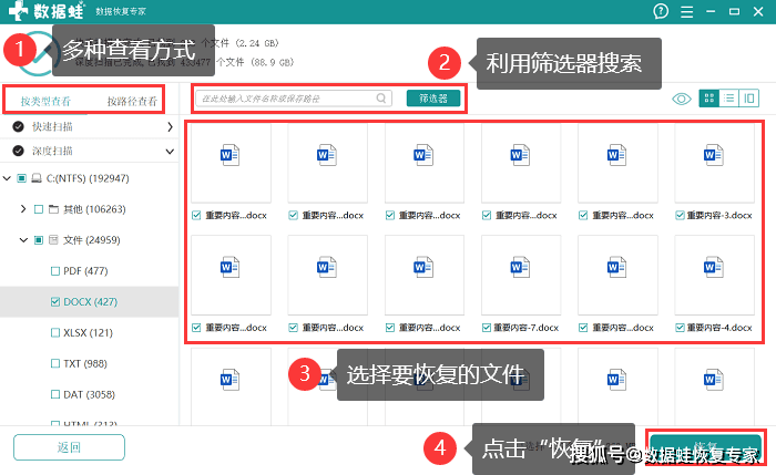 3.扫描结果可按需求进行查看,若初次扫描呈现结果较少,点击【深度扫描】,可获得更多的数据,勾选完需要恢复的数据后点击【恢复】即可手机存储空间不足怎么清理。