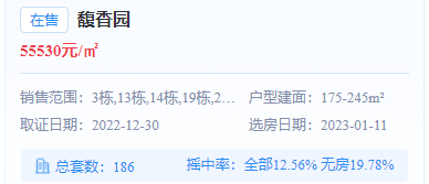 馥香园为纯大户型改善定位,精装限价55000元/㎡新房装修app苹果版 。项目首开(2022年12月30)186套房源,中签率仅约12.56%。