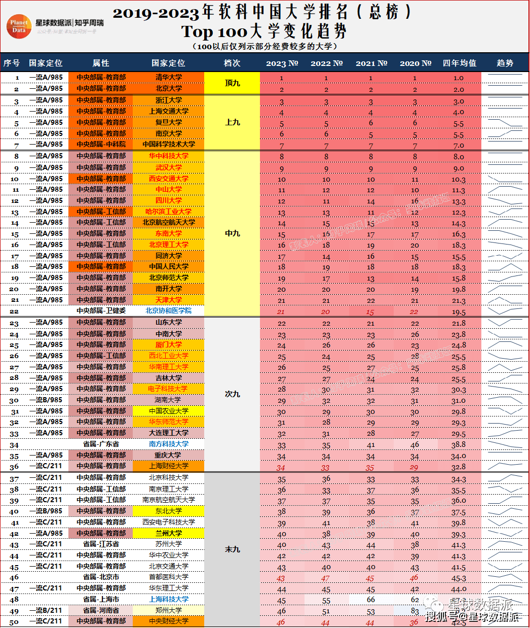 本文基于2020-2023年软科中国大学排名总榜的排名数据,梳理中国前100名校过去四年综合实力排名趋势,旨在向广大读者呈现中国当代名校发展格局及趋势,助力读者形成科学系统的大学档次格局认知金苹果版院校排名。