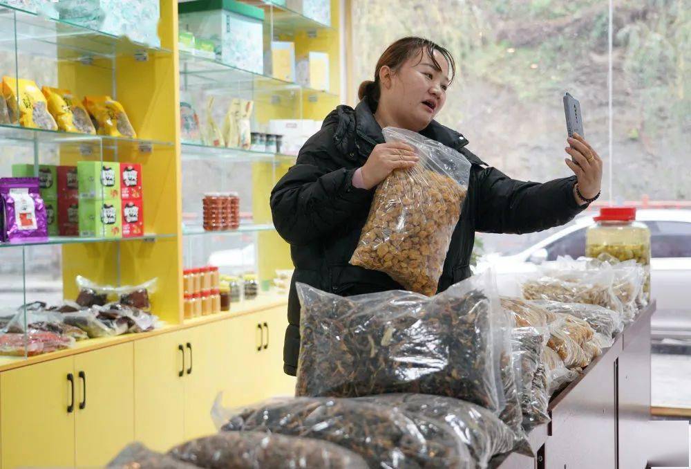 2022年11月23日,在陕西安康市紫阳县红椿镇七里沟社区电商服务站,一名自主创业的电商主播在直播带货营口帮扶通苹果版。新华社记者 邵瑞 摄